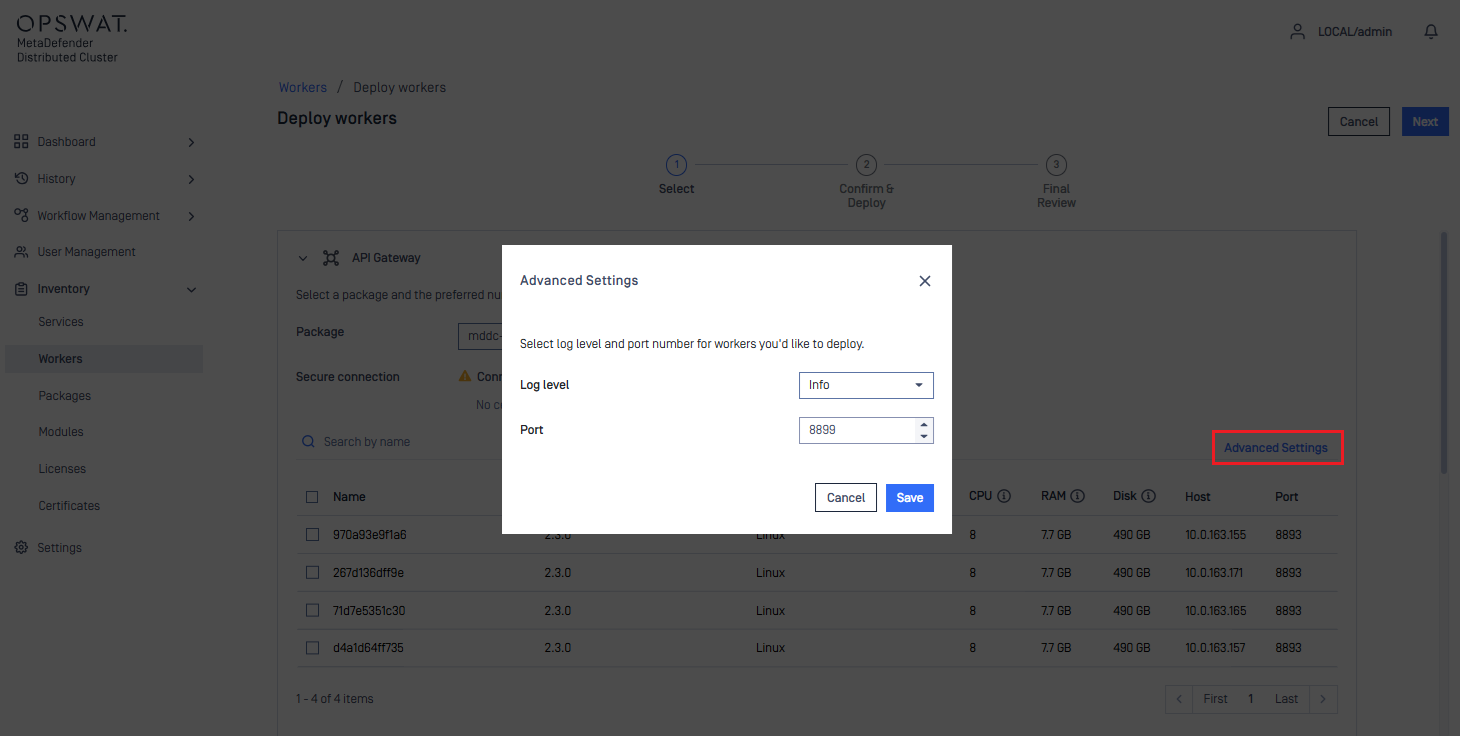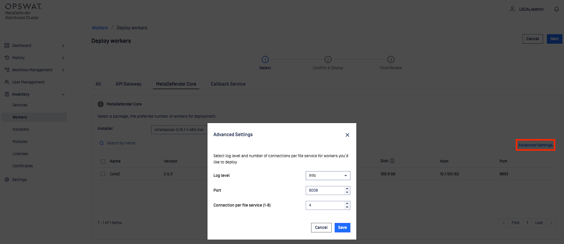 The system administrator can also modify the Log level, Port and Connection per file service of MetaDefender Core that will be deployed by selecting Advanced Settings.