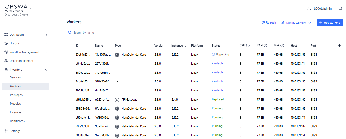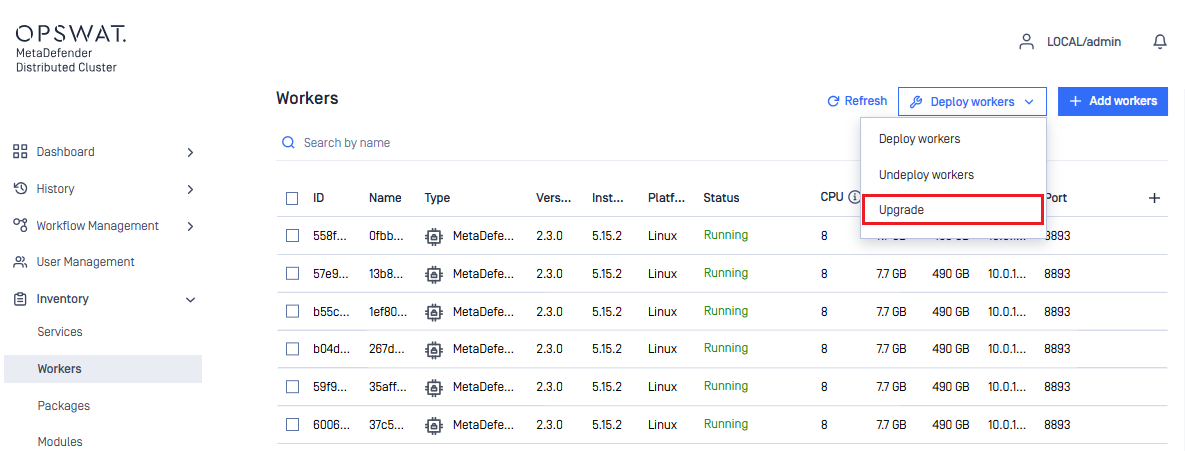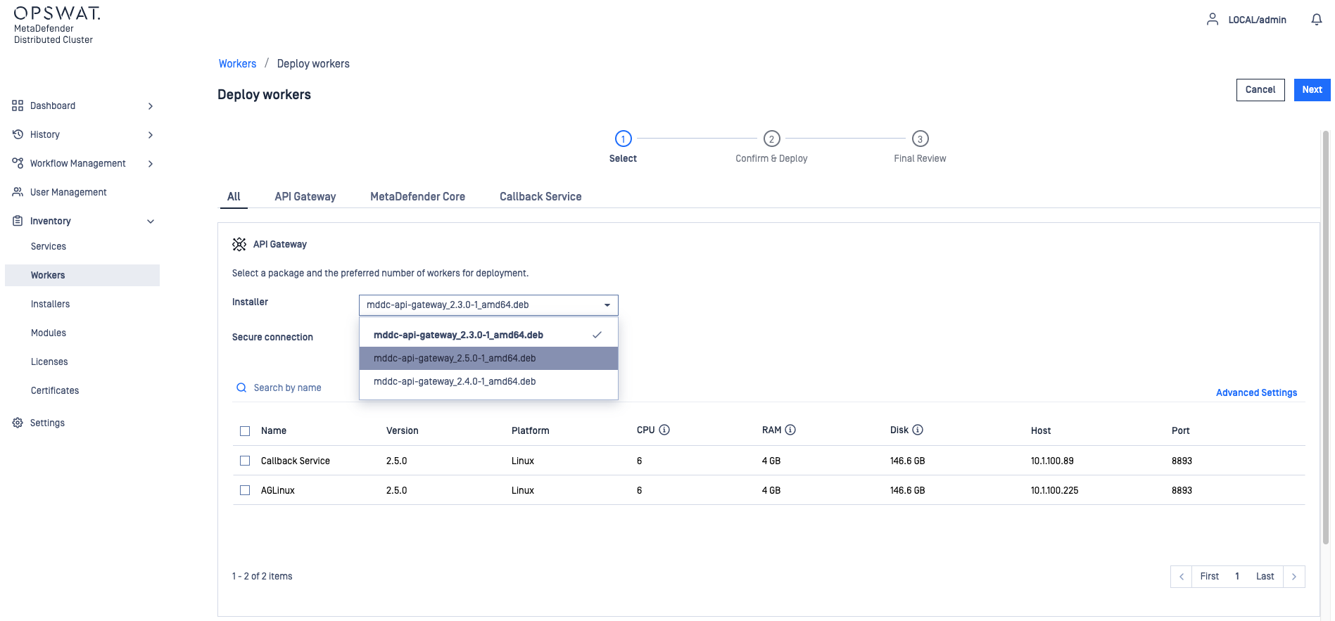 When a new version of MDDC API Gateway, MDDC Callback Service or MetaDefender Core is available. And all three installers have been uploaded to the Installers section. The system administrator can perform an upgrade for the three products by selecting the Deploy Workers menu and then Upgrade.