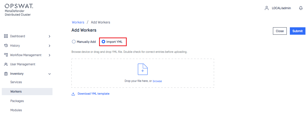The system administrator has an option to import the MDDC Workers via YML file instead of manually adding the MDDC Workers via MDDC Control Center UI. There is a template available to be downloaded when selecting the Import YML option. Below you'll find an example with an MDDC API Gateway and three MetaDefender Cores: