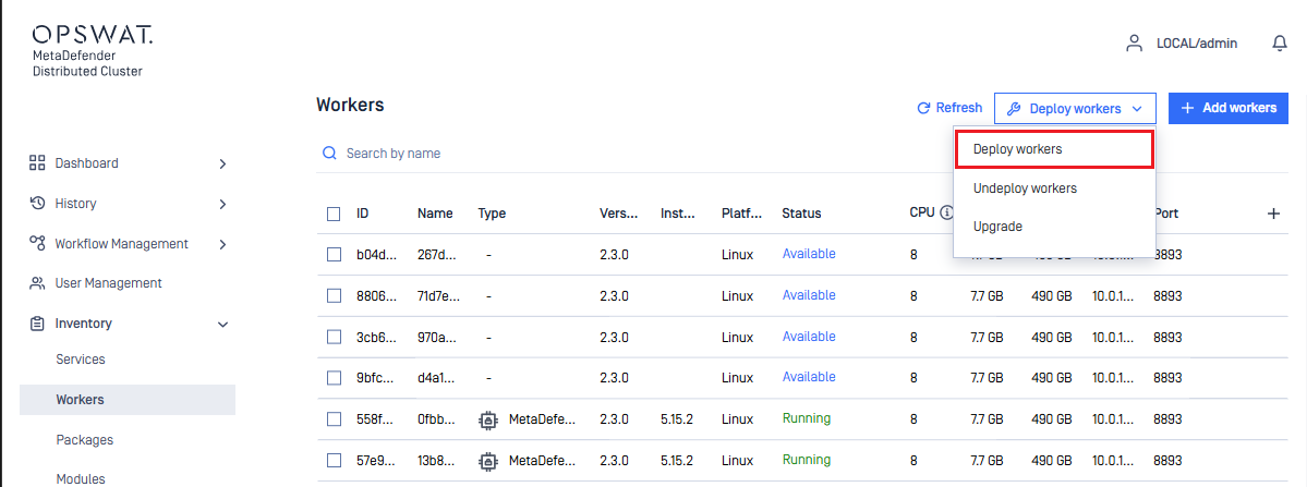 Once MDDC Workers have been added and their status are shown as Available. The system administrator can now deploy MetaDefender Core, MDDC API Gateway and MDDC Callback Service separately or all at the same time.