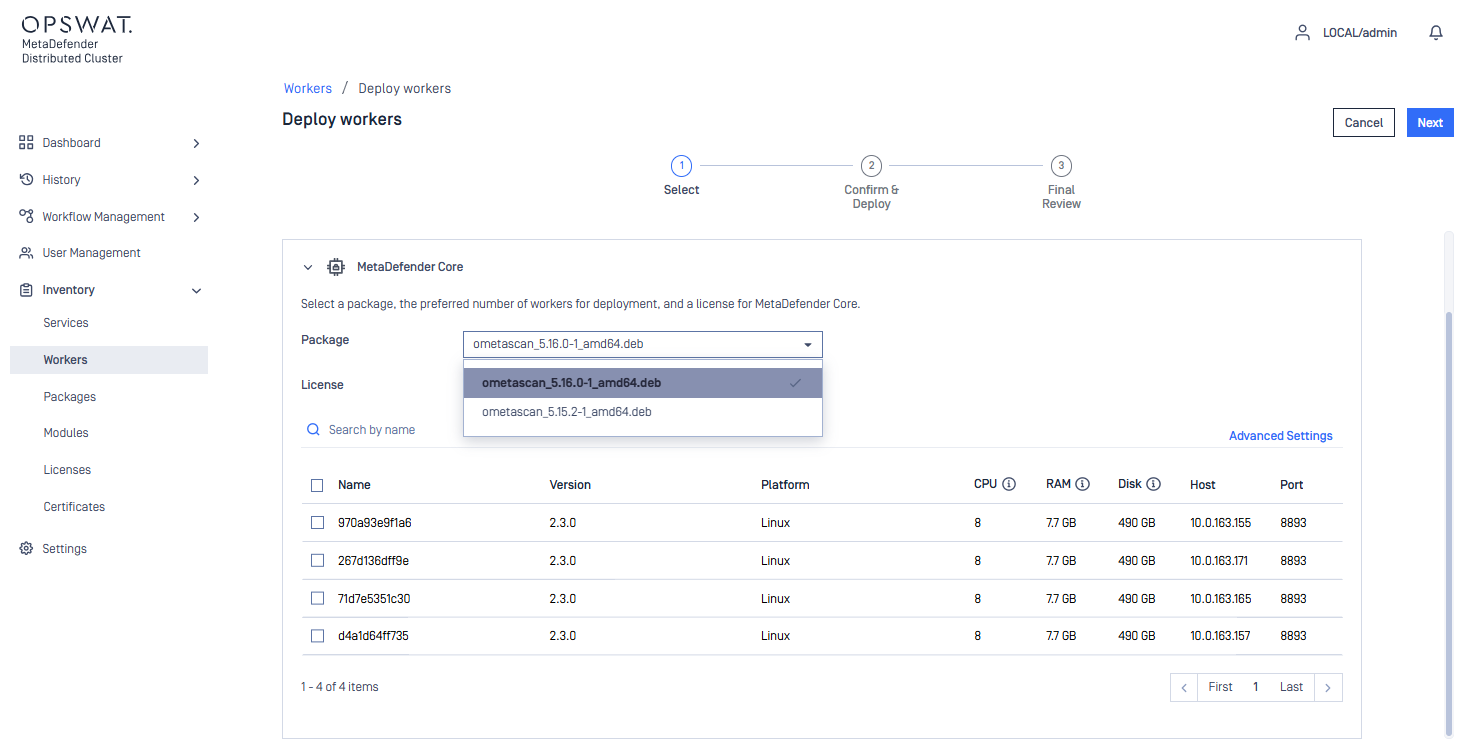 The system administrator can choose the version of MetaDefender Core should be deployed on available MDDC Workers.