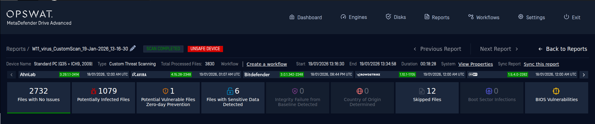 If MetaDefender Drive is configured with My OPSWAT Central Management, reports sync automatically after each scan — over Wi-Fi, cellular, or via MetaDefender Kiosk for on-premises air-gapped environments.