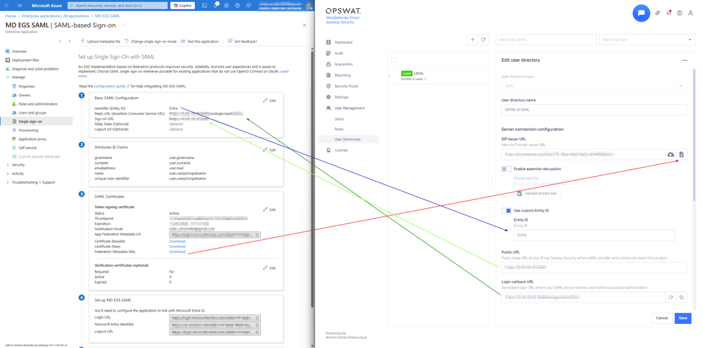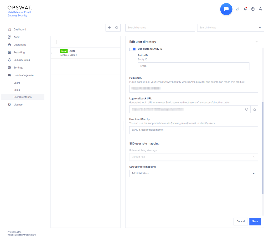Go to MetaDefender Email Gateway Security (EGS) Web UI > User Management > User Directories and create a new SAML User Directory, configuring everything as follows: