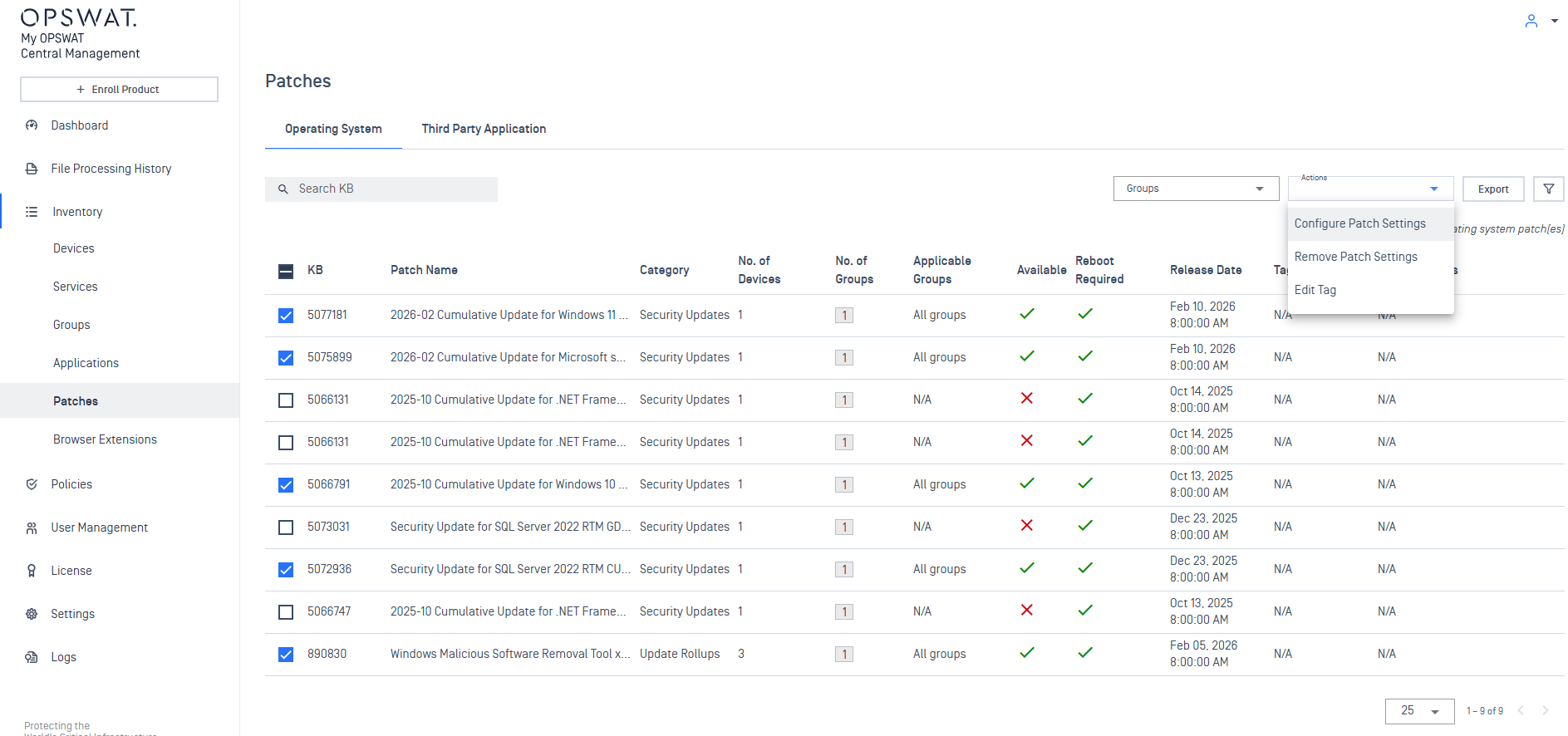 Select the KB patches to configure.