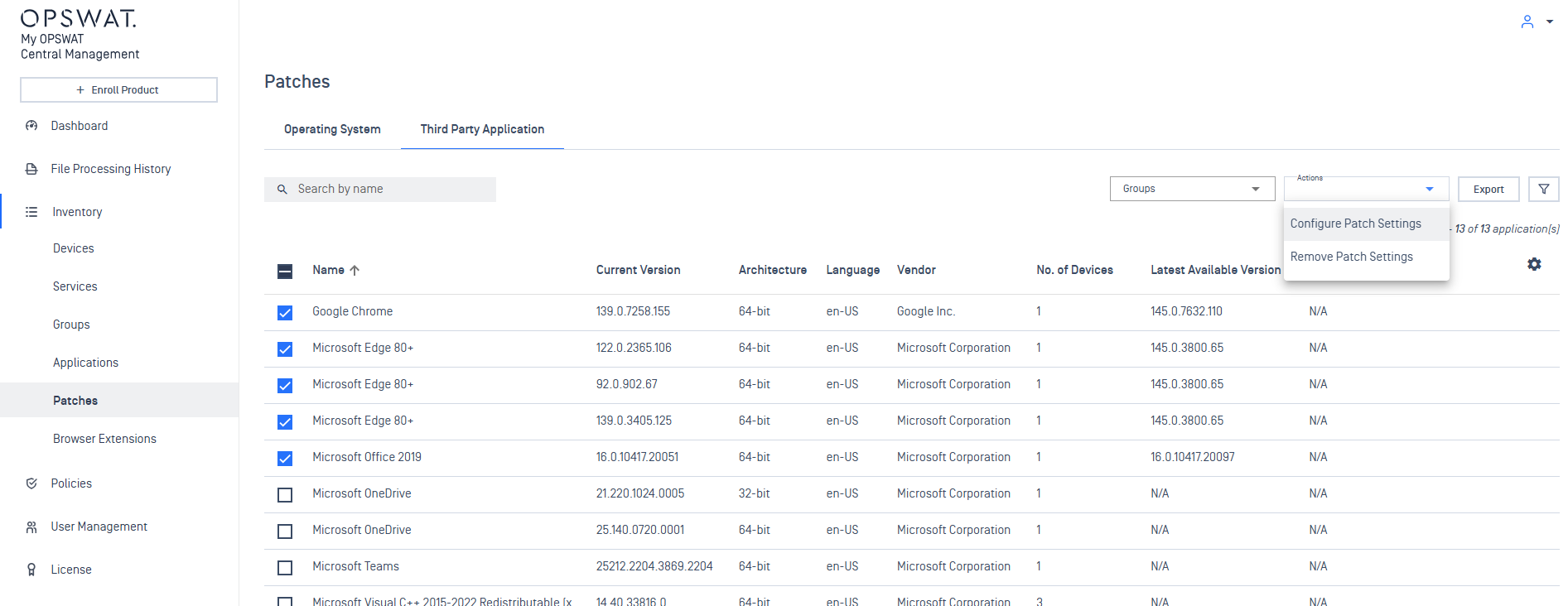 - Inventory > Patches > Operating System / Third Party Application tabs