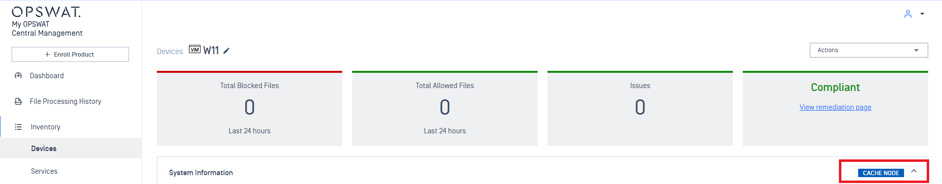 On the device's details page, open the Actions dropdown in the top right corner and select Set as Cache Node.
