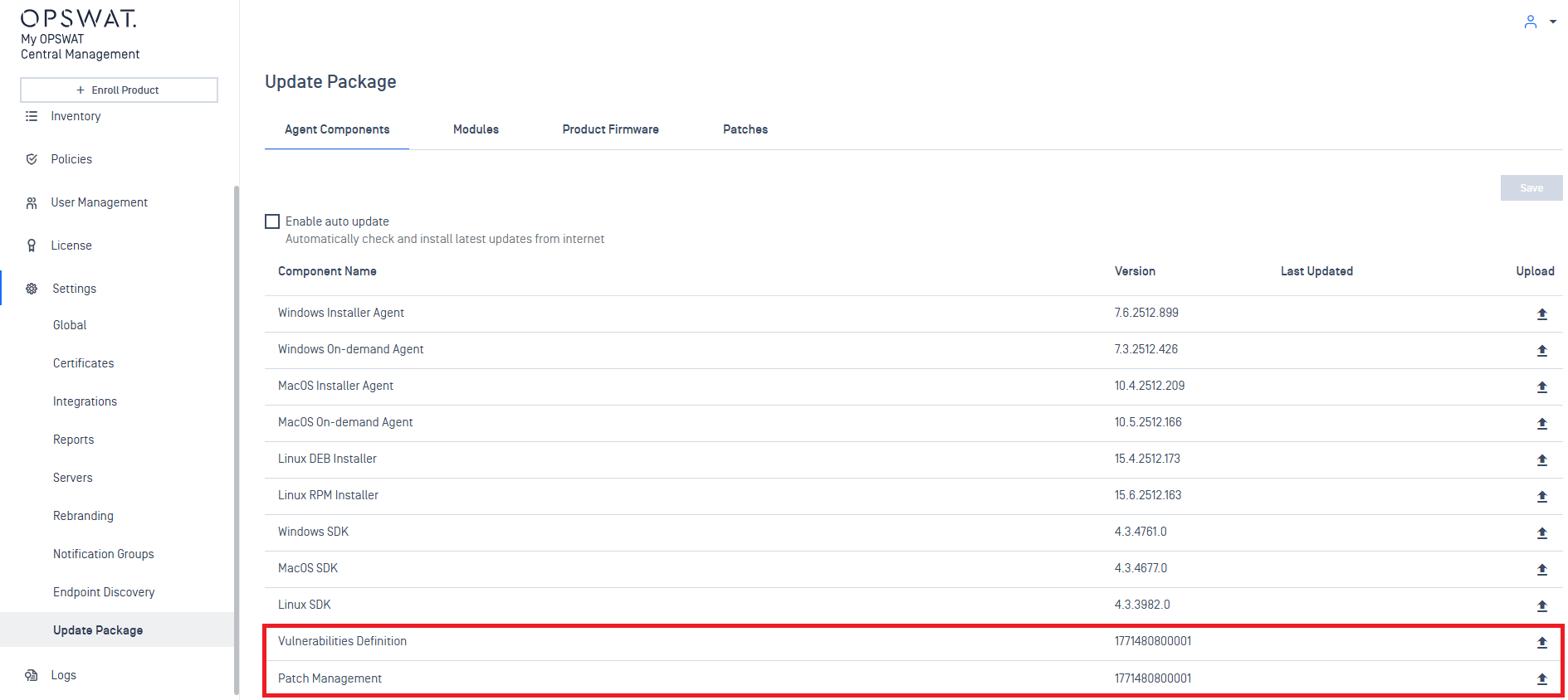 Definitions can then be uploaded in Settings > Update Package > Agent Components > Vulnerability Definitions / Patch Management