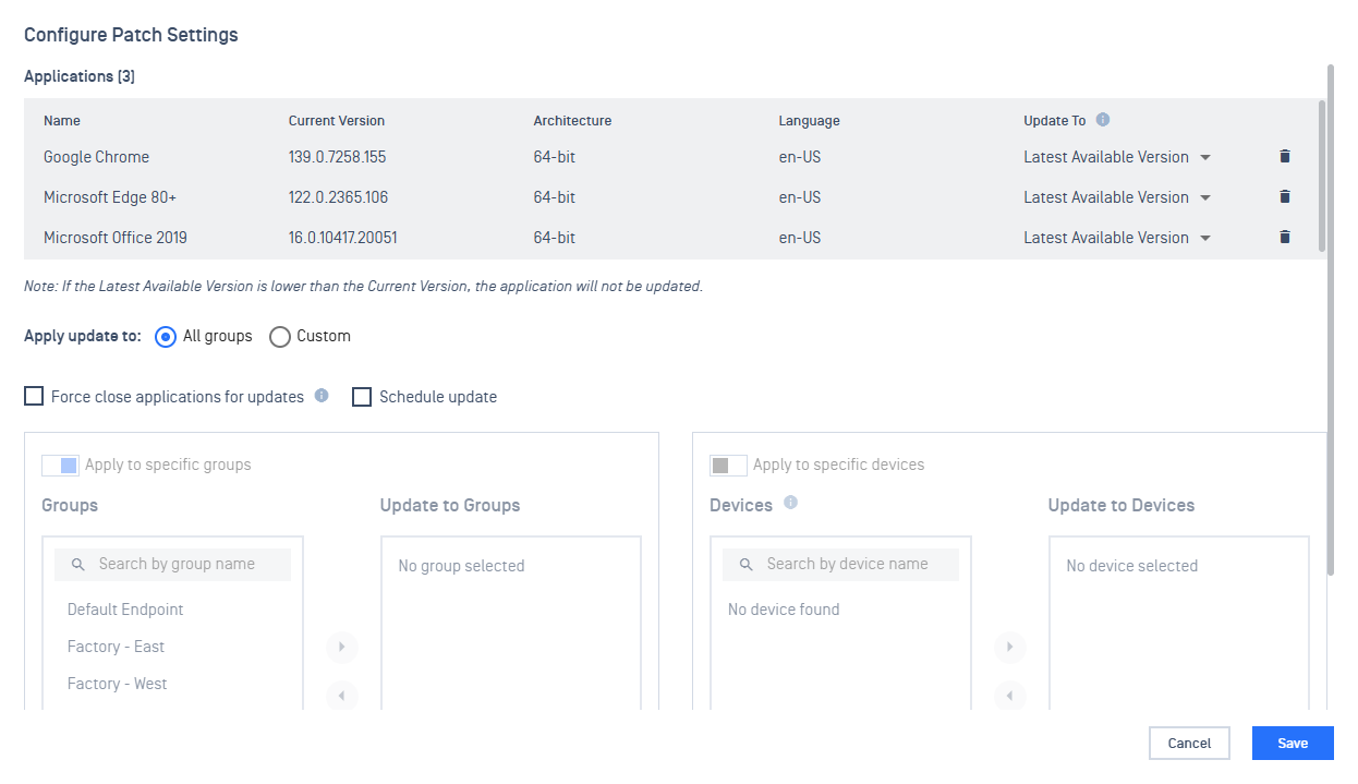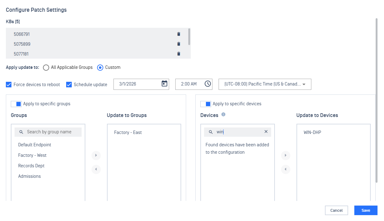 - Custom - enable selection to specify which groups / devices to apply the patch