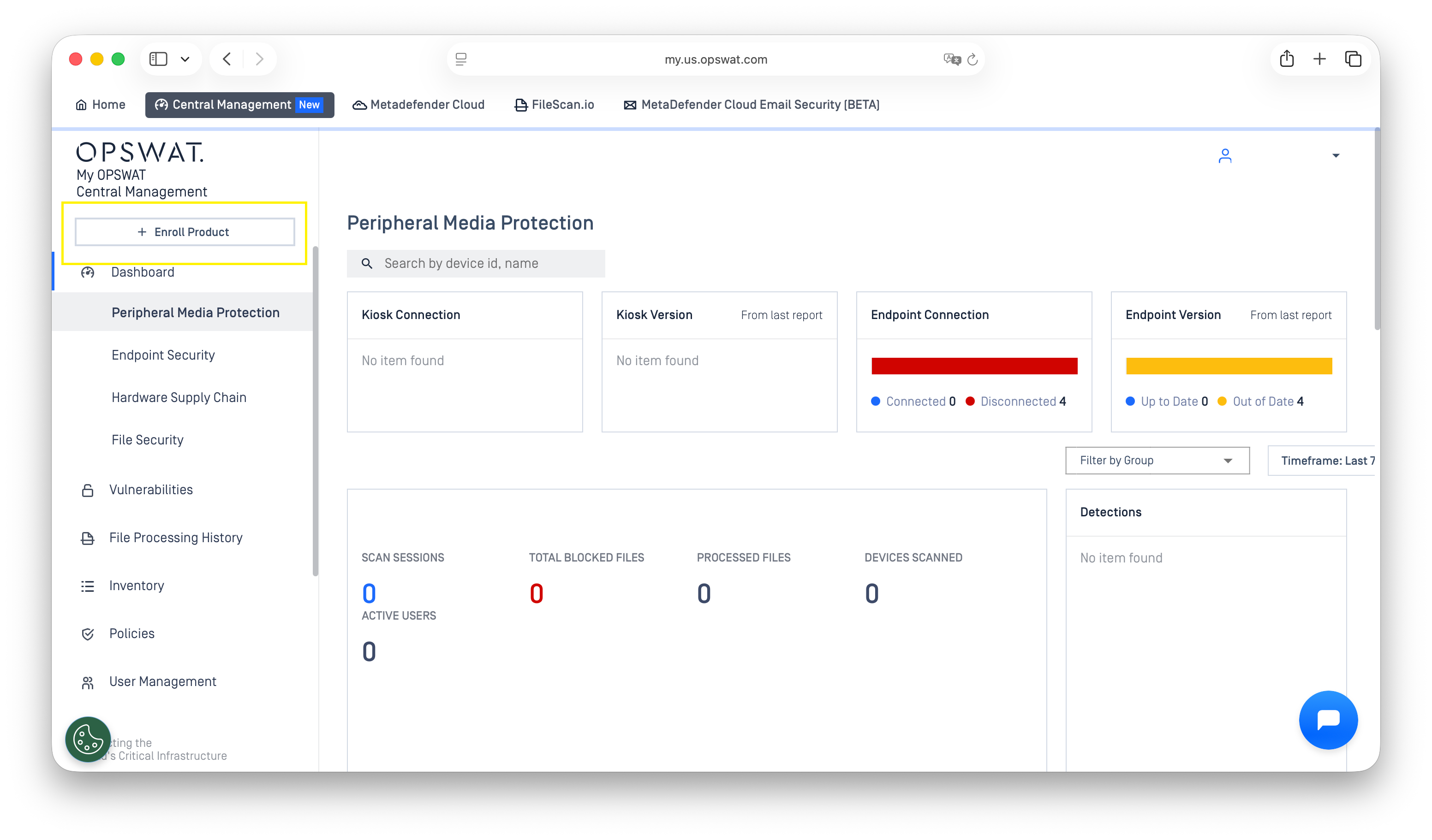- Log into My OPSWAT Central Management and navigate to Enroll Product button (to enroll a device without a group) OR Inventory>Groups>Relevant Group (to enroll a device into a group).
