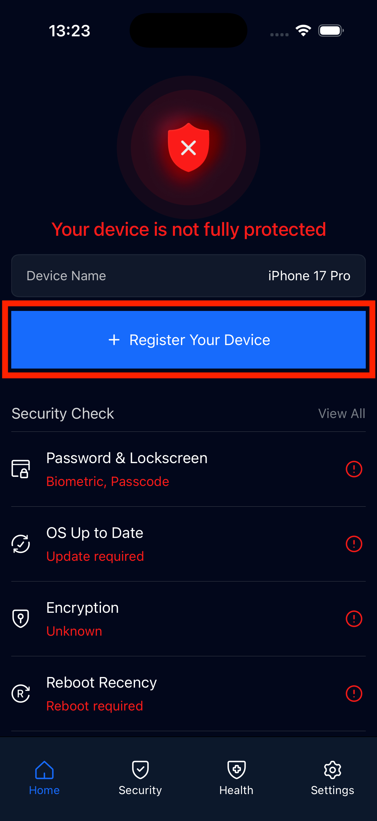 - Click the Register Your Device button in the bottom right-hand corner of your screen, as illustrated below