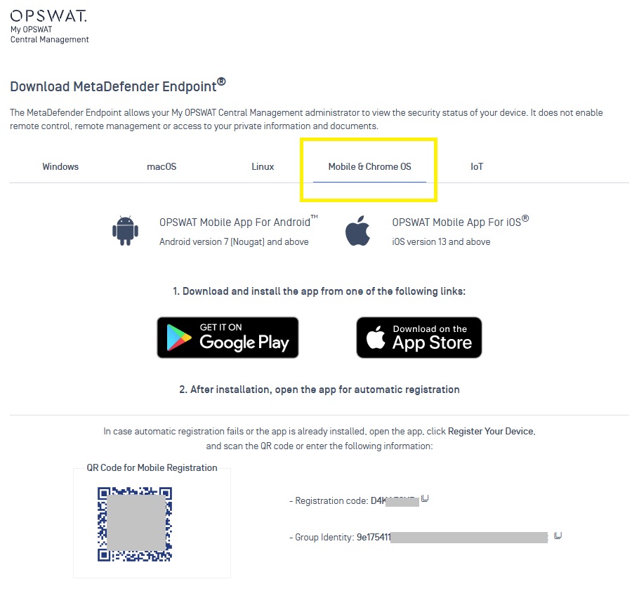 To register/enroll your mobile devices, you will need either a Registration Code or a QR Code, both of which are obtainable via My OPSWAT Central Management or via your administrator.