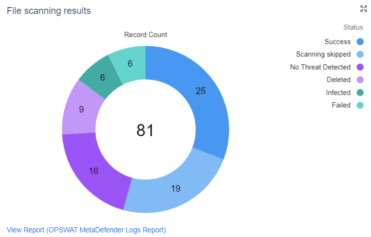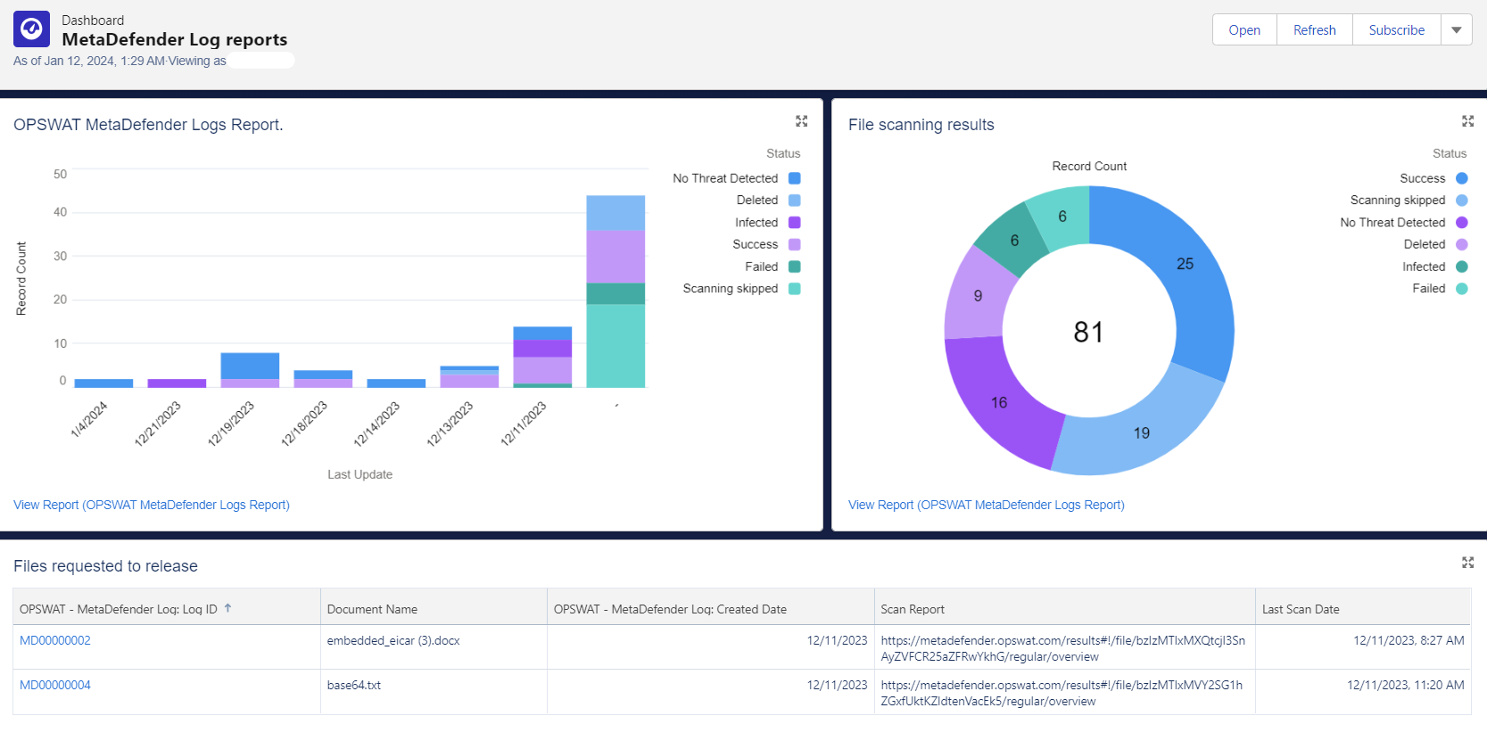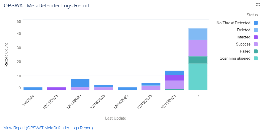 Within the MetaDefender Log Reports dashboard, you can gain a comprehensive overview of all files uploaded to your Salesforce environment. The dashboard provides counts for files categorized as "No Threat Detected" and files identified as "Infected."