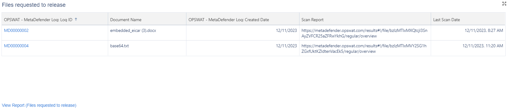 The Files Requested to be Released widget at the bottom exhibits a list of files uploaded by users that have been identified as infected and subsequently requested for release. It is crucial to scrutinize these files meticulously because even if the user believes them to be safe, they may still pose a threat. It is recommended to review the scan results for each file to understand the reasons behind OPSWAT's determination of the file as infected.