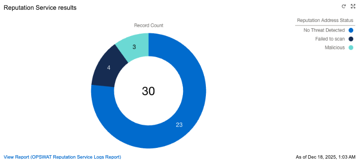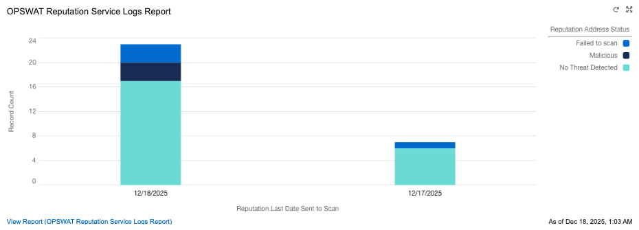 Within the MetaDefender Log Reports dashboard, you can gain a comprehensive overview of all files uploaded to your Salesforce environment. The dashboard provides counts for URL/IP/Domains categorized as "No Threat Detected", and the ones identified as "Infected/Malicious".