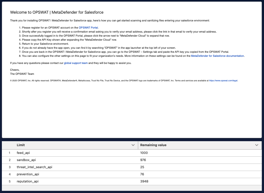 Within the table under the Welcome note, you have your remaining limits available within the apikey used in order to utilize MetaDefender Cloud for Salesforce, as displayed below.