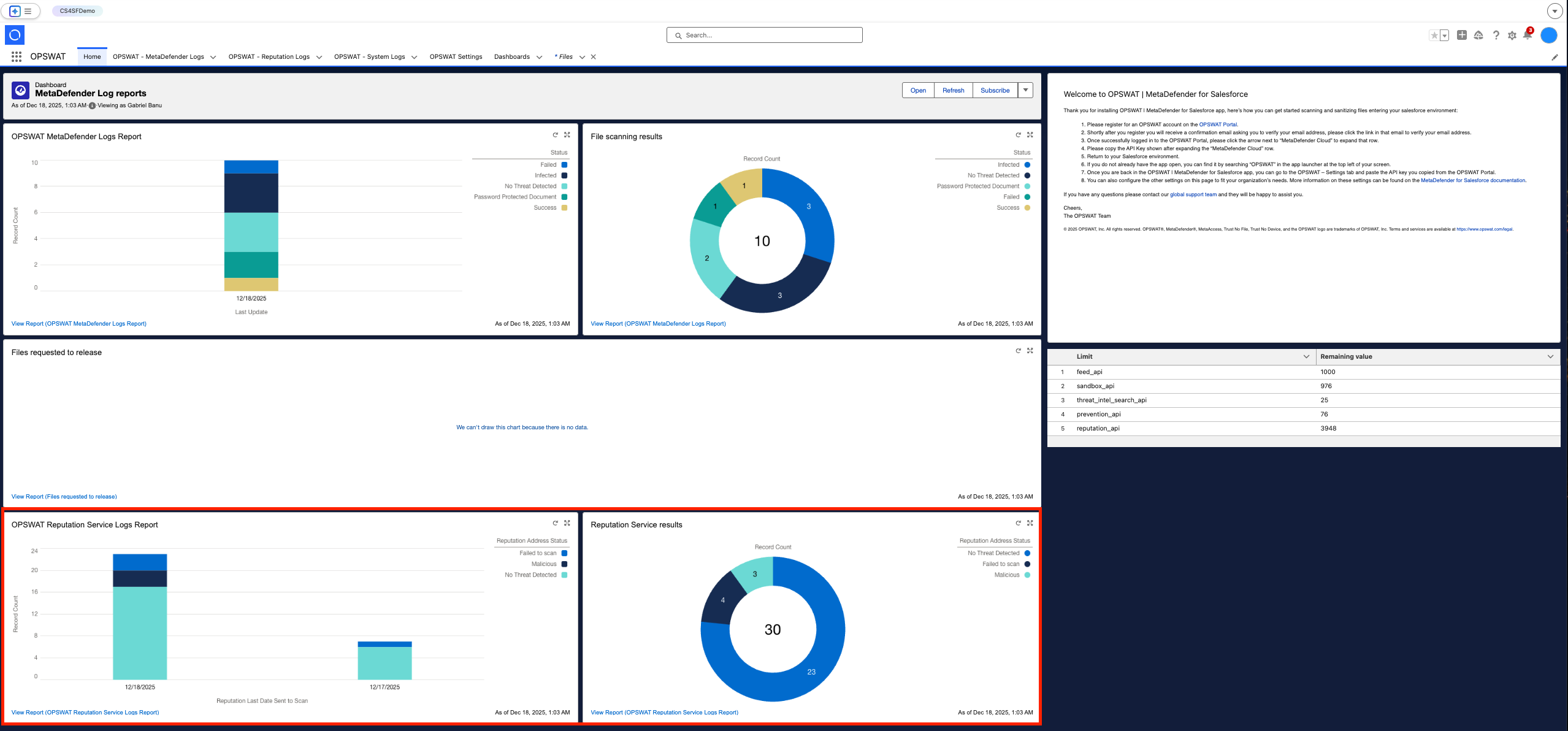 Explore the MetaDefender for Salesforce Command Center: Click on the Dashboards tab at the top of your OPSWAT - MetaDefender for Salesforce page!