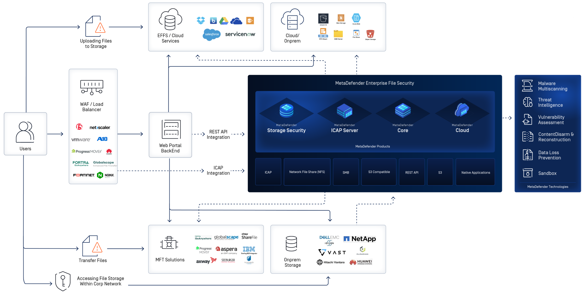 OPSWAT's MetaDefender solution provides additional integration options to easily implement advanced File Security in your organization. Whether you need to secure file uploads for a web application or files at rest in storage or files on the move with an MFT - on-prem, in the cloud, or somewhere in-between, OPSWAT can meet you where your data is.
