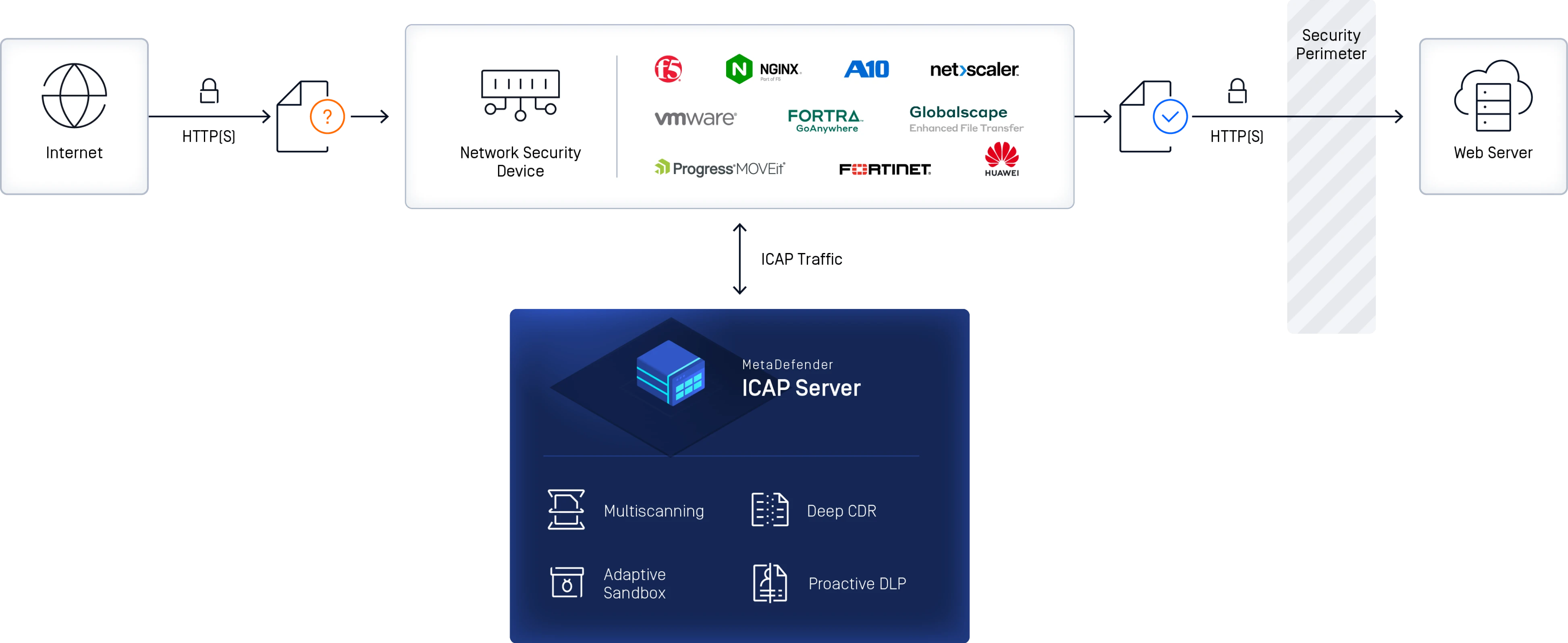 MetaDefender ICAP Server functions as a simplified interface to perform file scanning with MetaDefender Core. The ICAP Server integrates with network security appliances (firewalls, load balancers, proxies, application delivery controllers, WAFs, etc) and with MetaDefender Core, allowing all file-based traffic moving through the network device device to be secured.