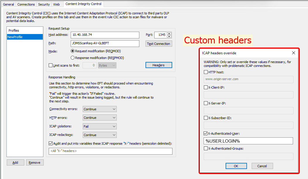 GlobalScape -> Go to profile -> Headers -> ICAP Headers override