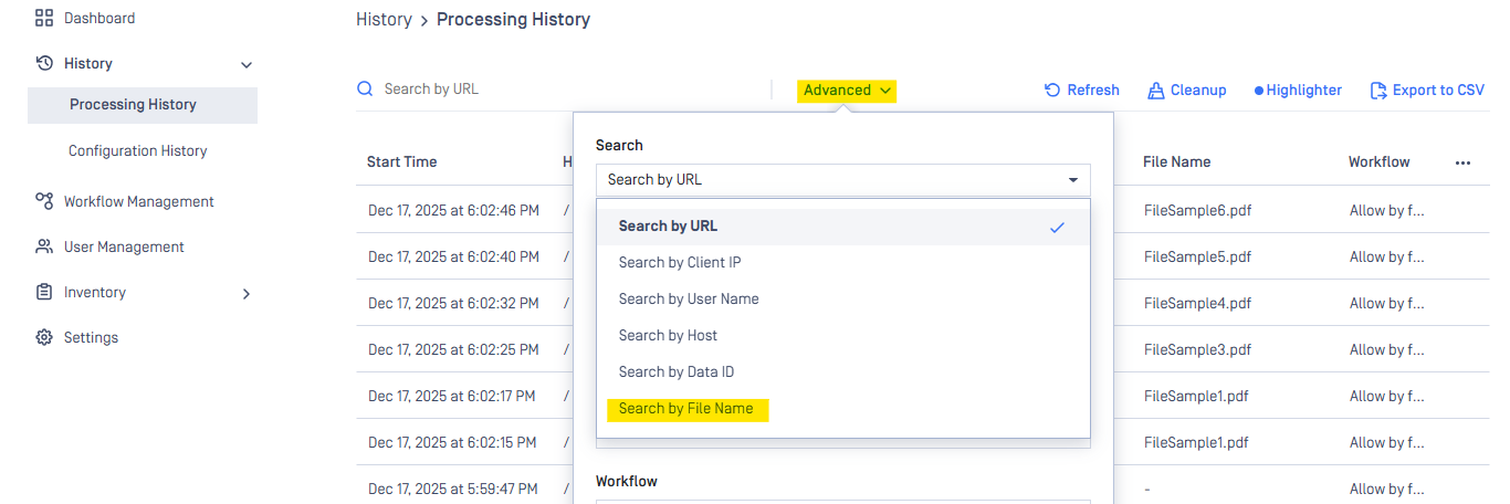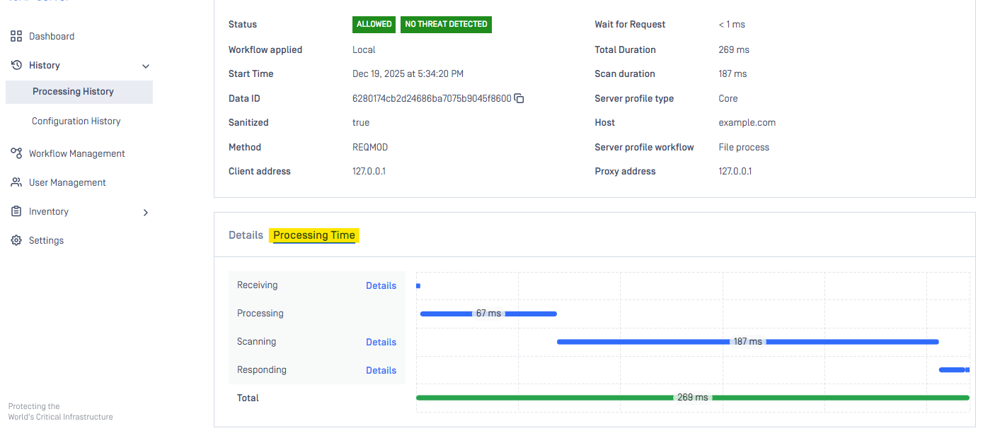 | Expanding processing history details | View a complete chronological timeline of each file's journey through the processing pipeline, including precise start and end times for every stage. Quickly identify bottlenecks and optimize performance by visualizing where files spend the most time, enabling faster troubleshooting and process optimization.