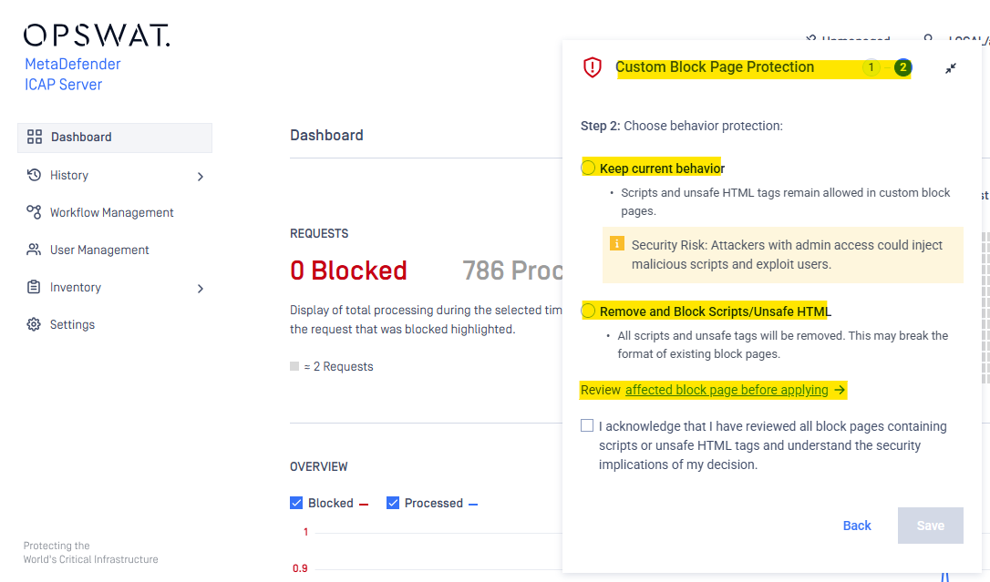 To toggle the option, use the configuration flag global/blockpage_allow_script_or_unsafe_html_tag (refer to Configuration file) |