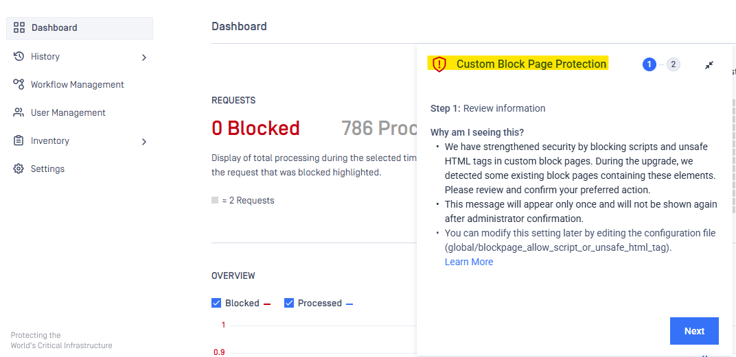 | Security Hardening for Block Page Content | Strengthen security with an option to disallow scripts and unsafe HTML tags in custom block pages.