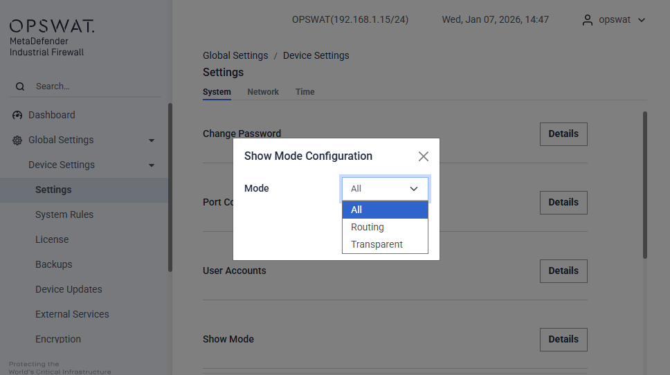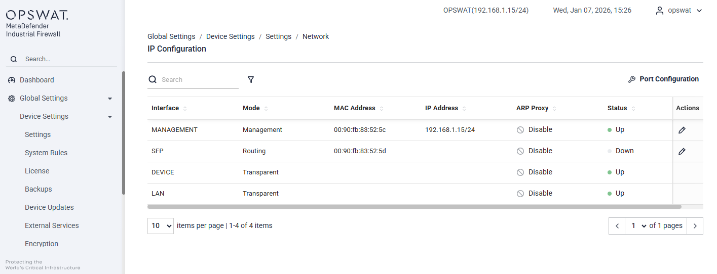 Port Configuration: Configure the operating mode for each interface. By default, both LAN and DEVICE interfaces operate in Transparent mode, as described in the System tab.