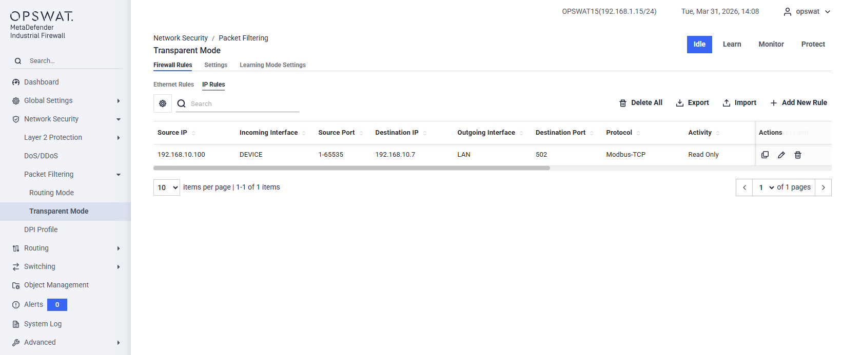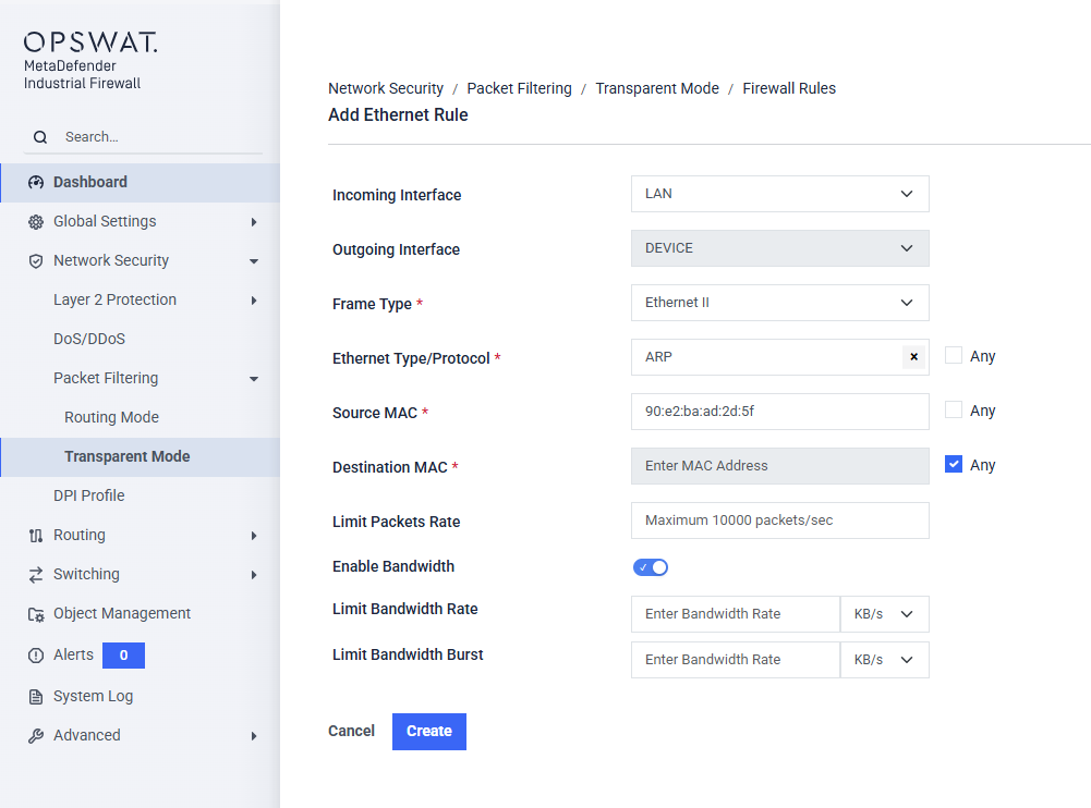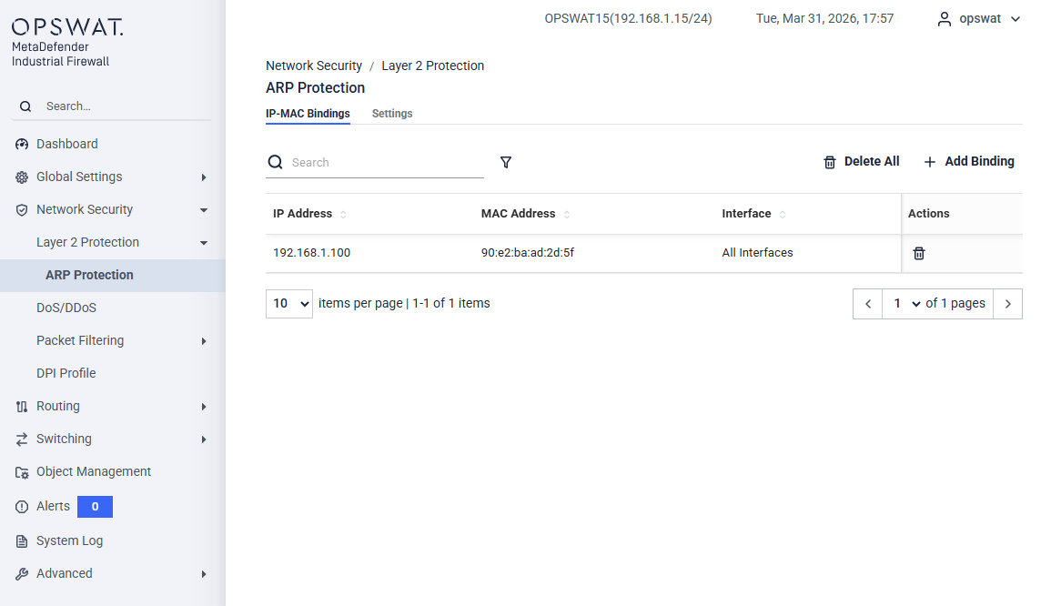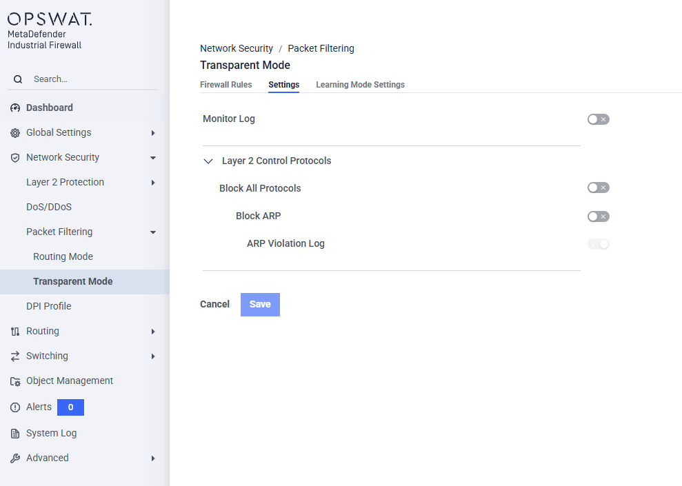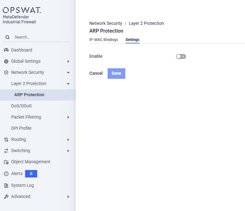 This page allows administrators to secure the OT network against ARP spoofing (ARP poisoning) and Man-in-the-Middle (MitM) attacks. By strictly managing how Address Resolution Protocol (ARP) packets are handled, the IFW ensures that malicious devices cannot hijack traffic intended for legitimate PLCs or SCADA servers. It's only supported for Transparent Mode.__