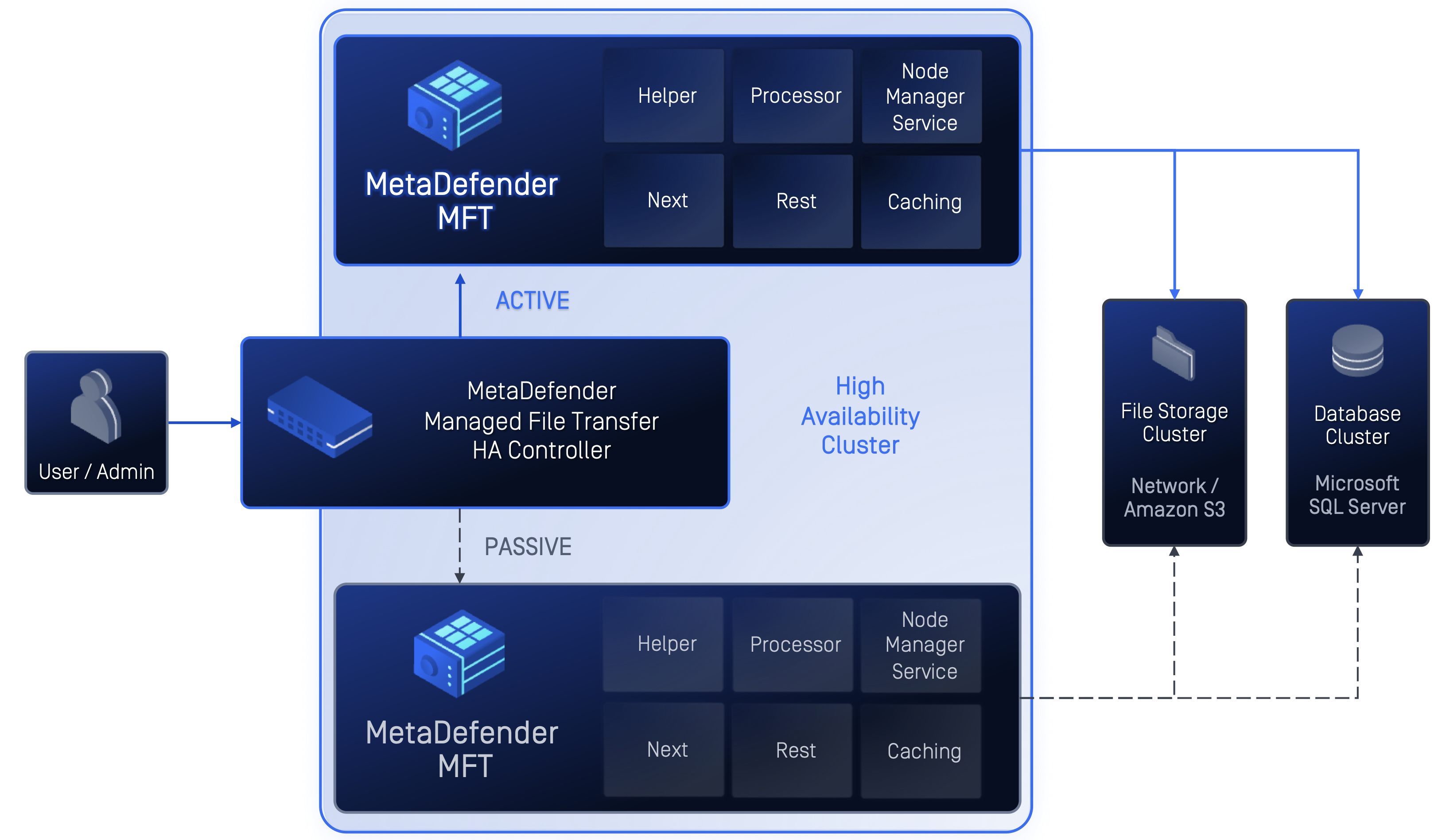 Passive MetaDefender® MFT Node | Idle in standby mode. When instructed to activate, it starts up application services, connects to the shared storage and database, and begins serving requests. |