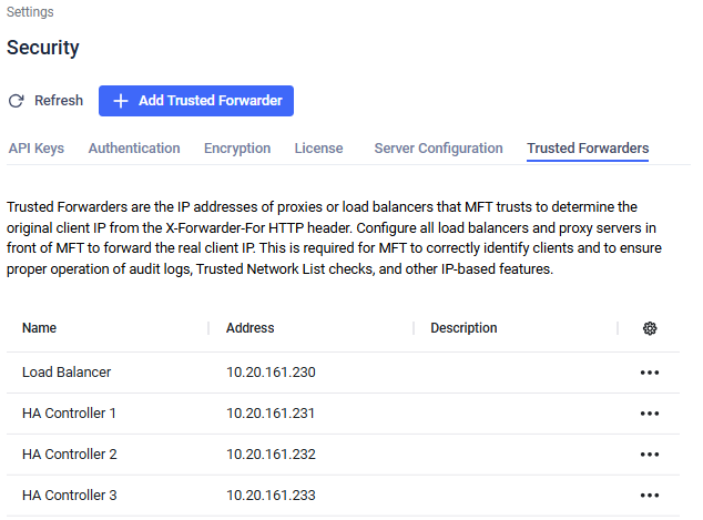 Additionally, the MetaDefender® MFT application must be configured to trust the load balancer’s IP address as a forwarder, this means adding the load balancer and each MetaDefender MFT HA Controller™’s IP to the list of trusted forwarders so that the X-Forwarded-For header is accepted and used to determine the client’s real address.