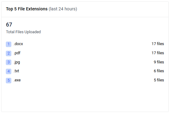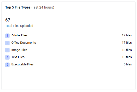 Shows the top five file type categories by upload quantity within the selected period, along with the overall total. Use this widget to quickly identify predominant file types.