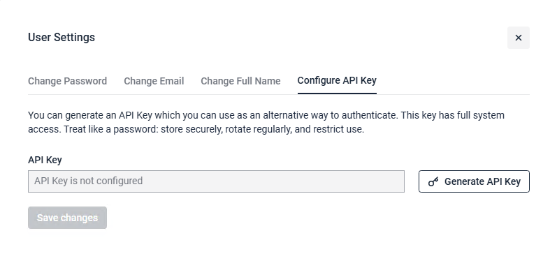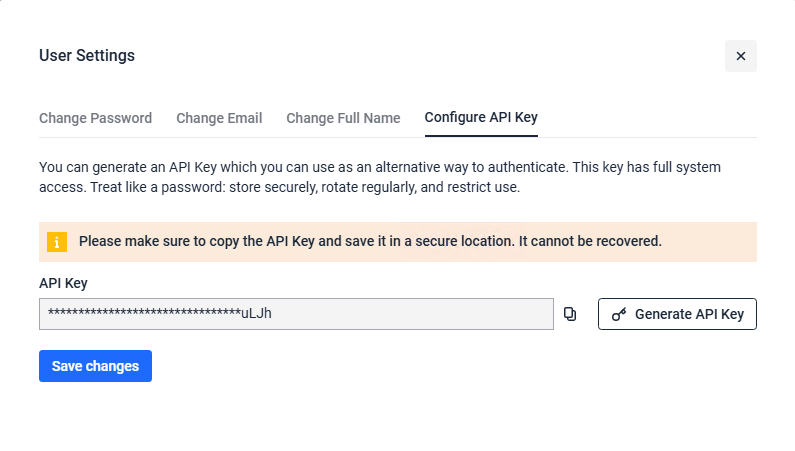 The API key can be copied only at this step and is saved only after clicking the save changes button. If an API key already exists, it will be updated.