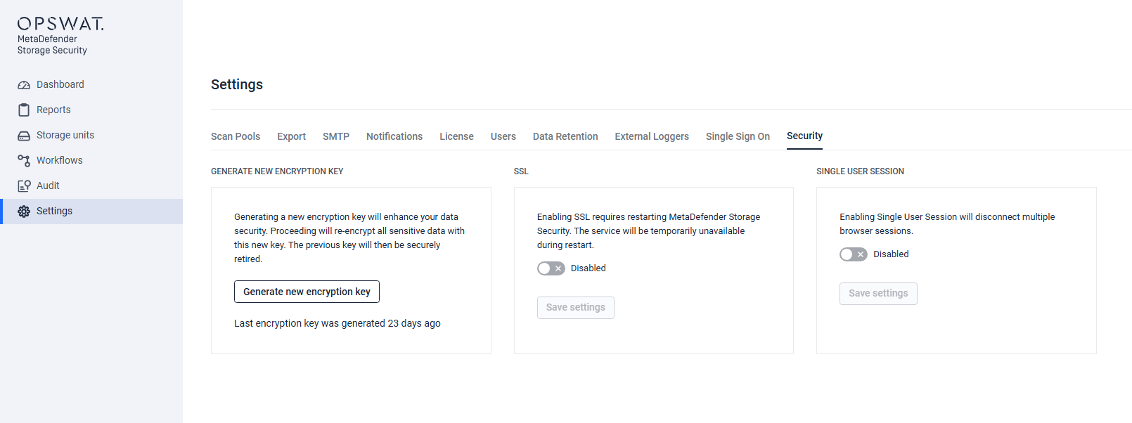 To enhance your system's security, you can generate a new master encryption key. This action will re-encrypt all sensitive data—such as storage credentials, API keys, and others—and securely retire the previous key.