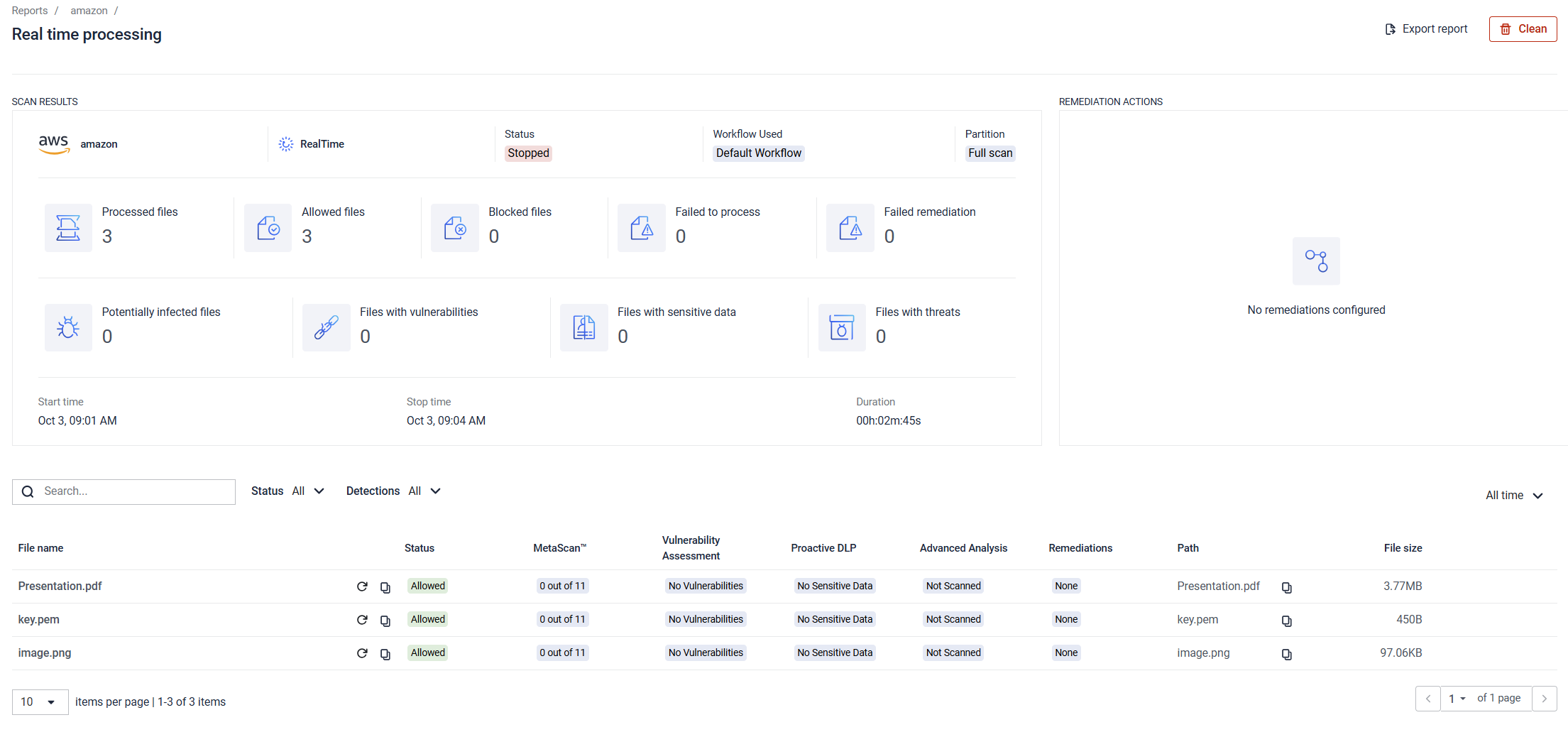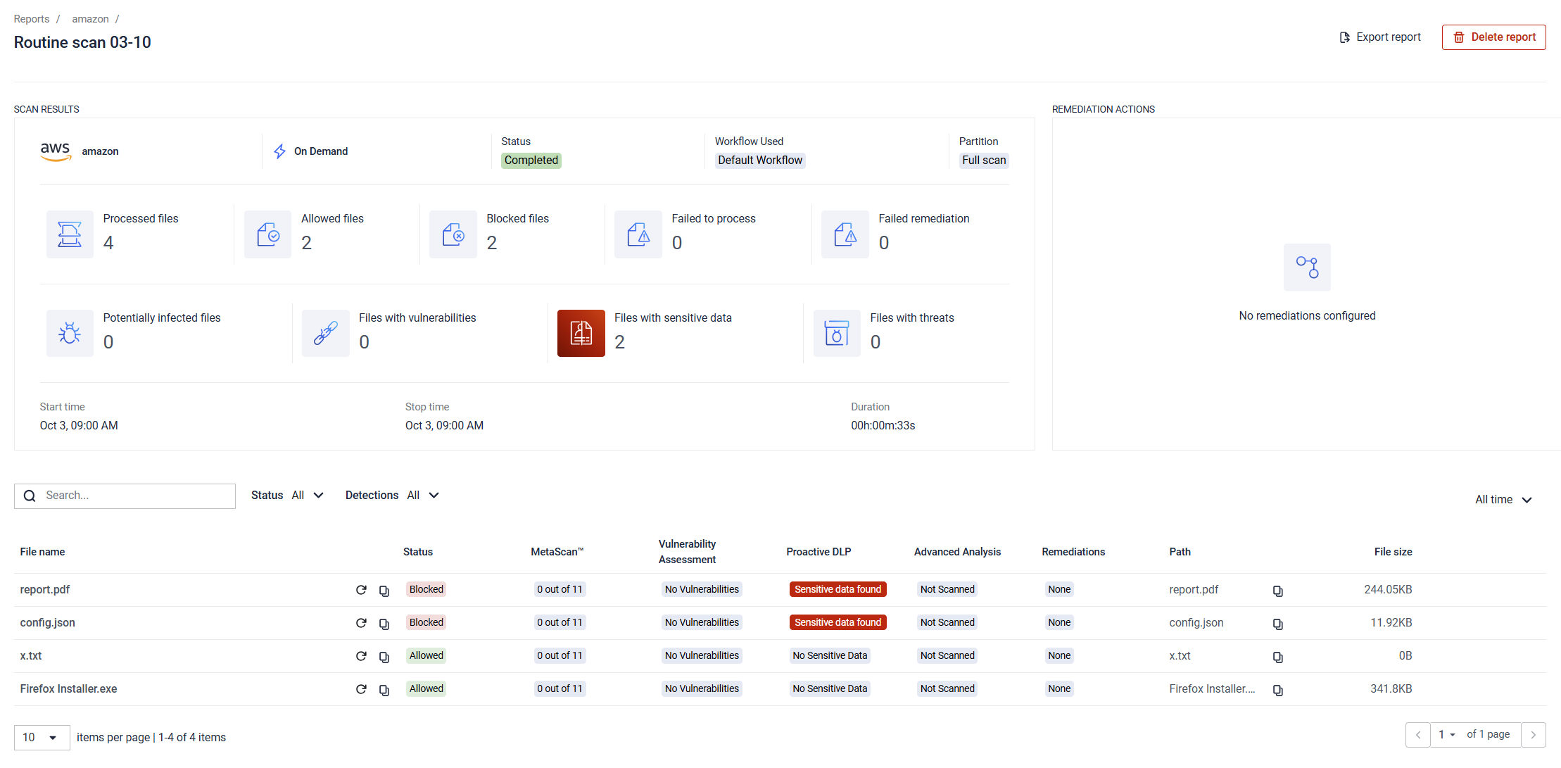 After a process is finished a report is produced for you by MetaDefender Storage Security. This report has information about the overall scan of your storage (i.e. the number of detected issues) as well as individual file analysis details.