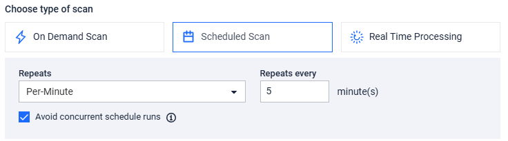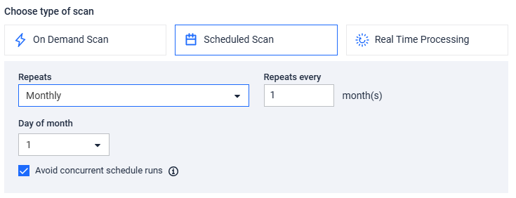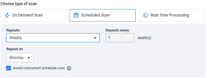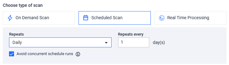 • Avoid concurrent schedule runs - When enabled, the system will skip a scheduled scan run if the previous run is still in progress. This prevents multiple scans from running simultaneously.