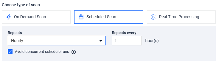 Real-Time Processing continuously monitors your storage integration for any new or modified files after the scan has started. This option includes: