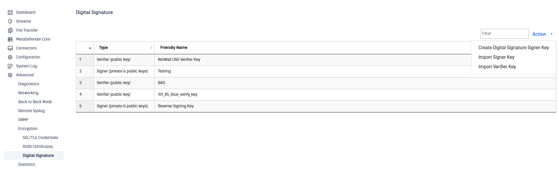 MetaDefender Optical Diode can be configured to apply a digital signature on a file and validate the signature when transferring files between two sites or domains. The feature requires the use of two Optical Diode devices, one at Site A and another at Site B. The Optical Diode can be configured to perform one of the following options:
