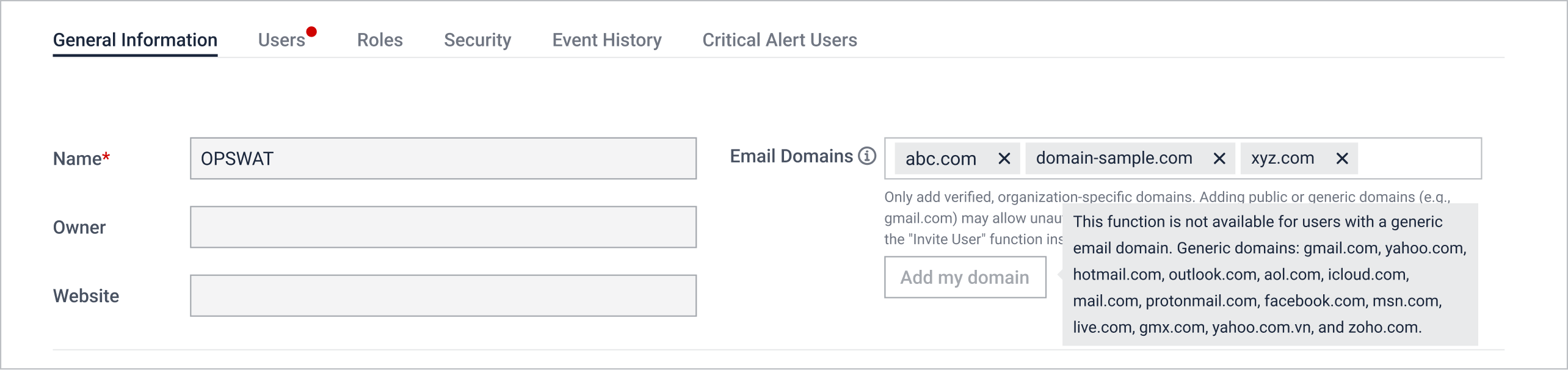 | Blocking Generic Domains in Approved Email Domains | To prevent exposing your organization broadly, we now block the use of below generic email domains in the Company Email Domain field under My Organization > General Information.