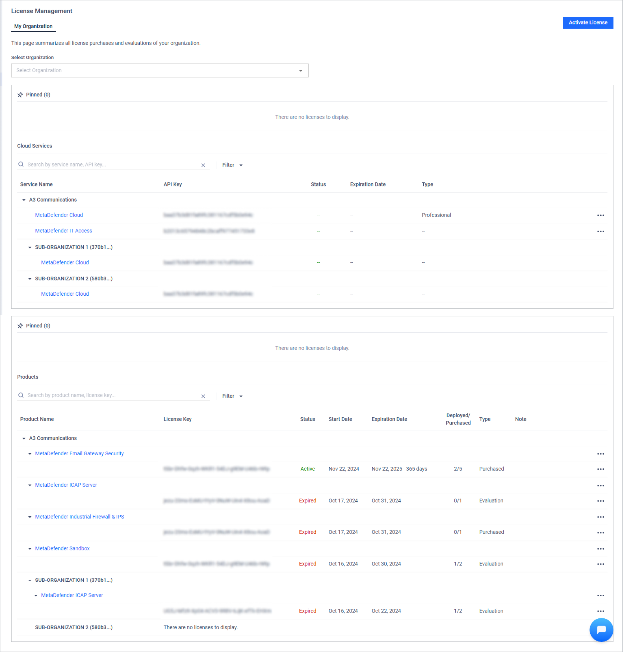 If you have the necessary permissions, access licenses for your organization and its sub-organizations.