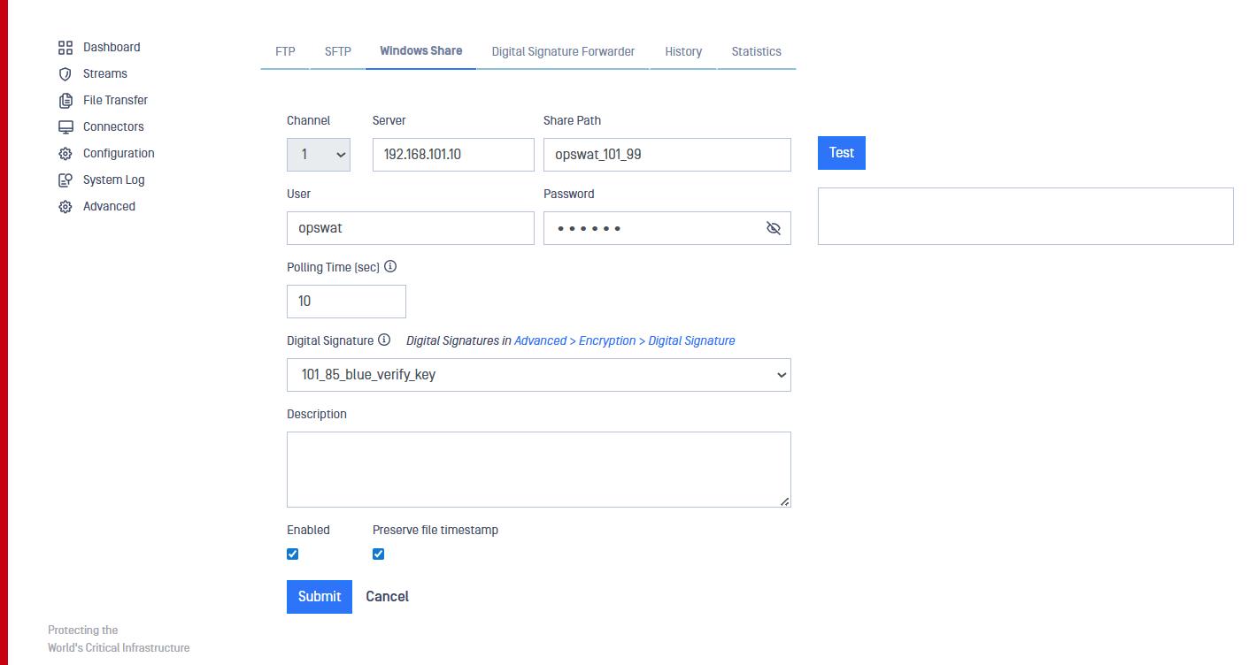 Connection can be tested to validate the configuration by pressing Test button.