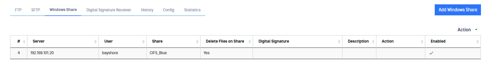The Optical Diode allows the user to configure mixed file transfers. For instance a user can configure a WFS file share on the BLUE side and a FTP share on the RED side. The Optical Diode BLUE will take files from the Windows Share, transfer them to the Optical Diode RED then transfer the files to a FTP server configured on the RED side. To do that: