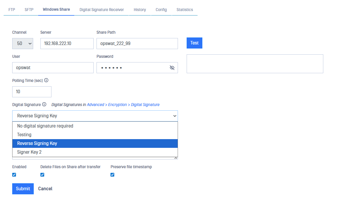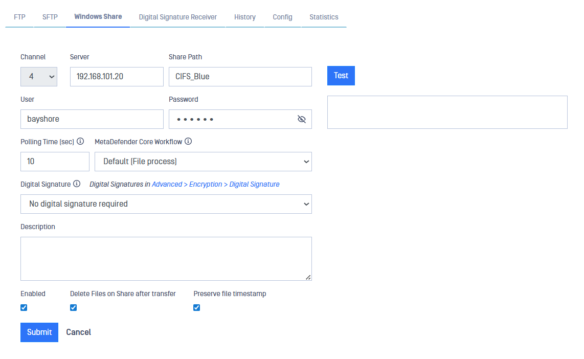 Polling Time (sec): How often to poll the file share for new files (default: 10 secs, allowed values from 10 to 3600).